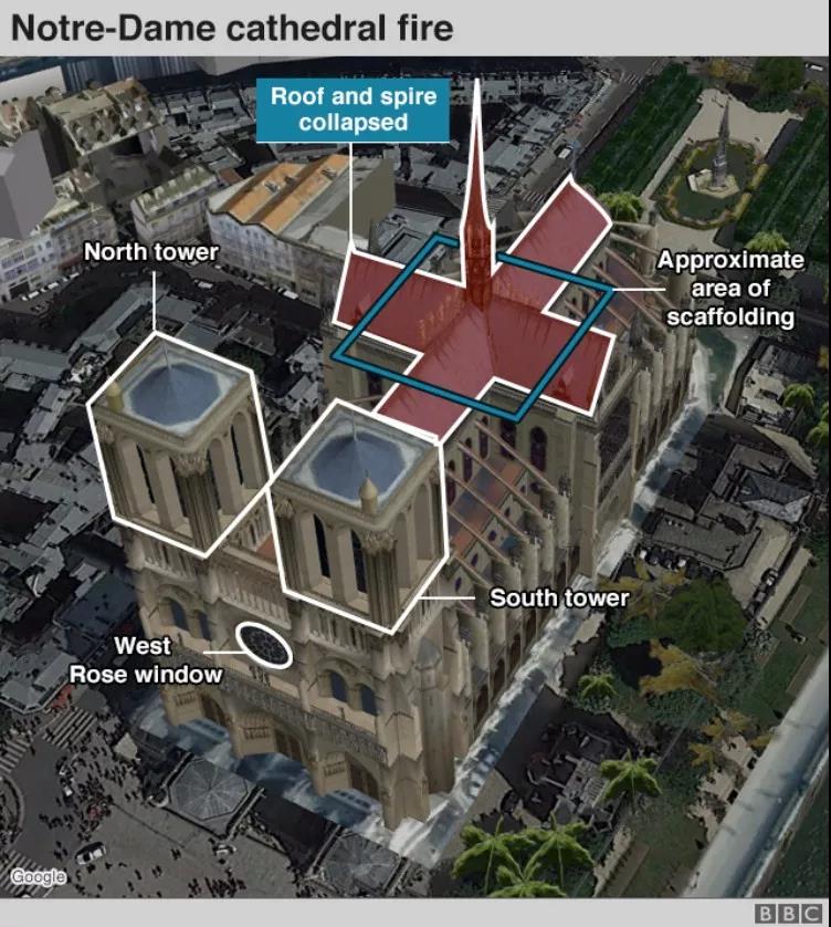 首先燃燒起來的位置,位于巴黎圣母院頂端的尖塔周圍。