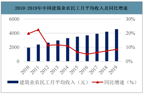 2010-2019年中國建筑業農民工月平均收入及同比增速