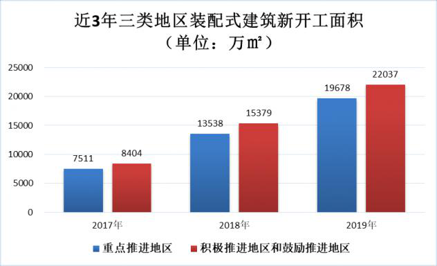從近三年的統計情況上來看,重點推進地區新開工裝配式建筑面積分別為7511萬 m²、13538萬 m²、19678萬 m²,占全國的比例分別為47.2%、46.8%、47.1%,這些地區裝配式建筑政策措施支持力度大,產業發展基礎好,形成了良好的政策氛圍和市場發展環境。