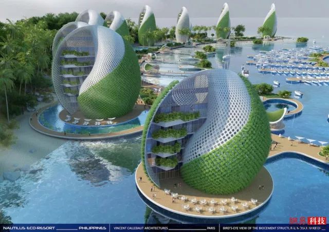 螺旋式生態建筑:Nautilus Eco-Resort生態度假區的設計靈感來自斐波那契(Fibonacci)螺旋,它采用了水培生長技術和其他將植物生長融入建筑的工具。