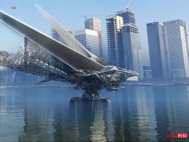 機器人式浮橋:這棟建筑看起來像《飛翼高達》(Gundam Wing)中的人形機器人,但它實際上是一座浮橋。這個實驗設計來自Margot Krasojevi,受蒙古鄂爾多斯政府委托設計,它可以折疊,甚至能移動位置。