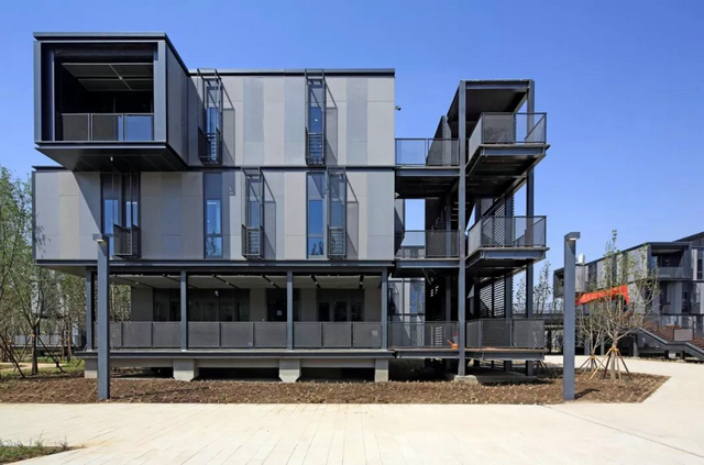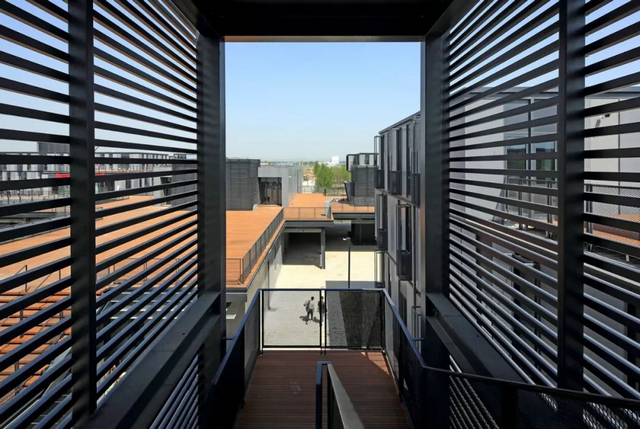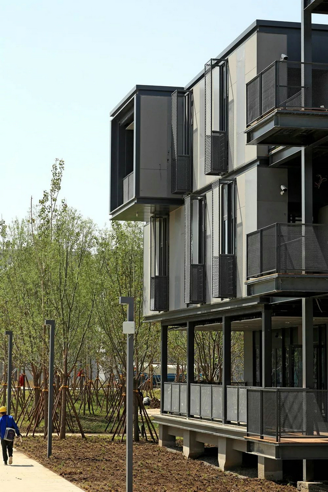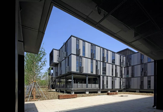 在材料方面,則選取水泥壓力板、金屬網與玻璃作為建筑立面材料,以集裝箱為單位,標準化分隔,便于高效生產與施工。同時,金屬網種植綠色爬藤,以垂直綠化營造園區生態環境。