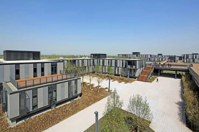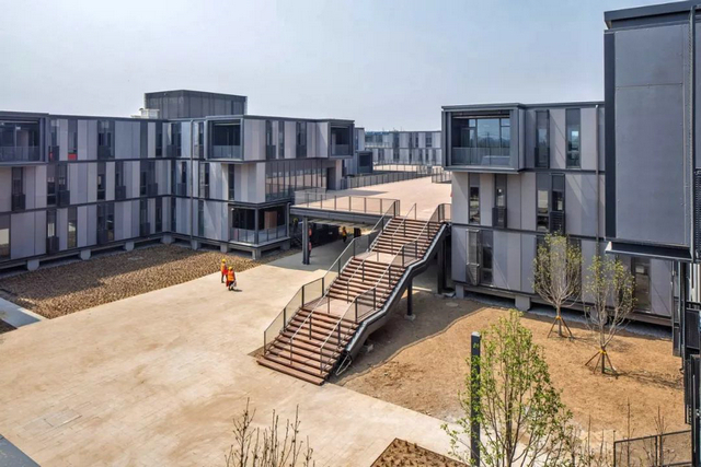 作為雄安新區的起步項目,設計既要滿足快速建造的要求,也要對未來建設提供示范。企業辦公區采用了全裝配化、集成化的集裝箱式建造技術,裝配化率達80%-90%,實現結構、內裝、外裝、設備管線全工廠生產,整體運輸至施工現場統一吊裝,最大限度減少建造垃圾,實現綠色施工。