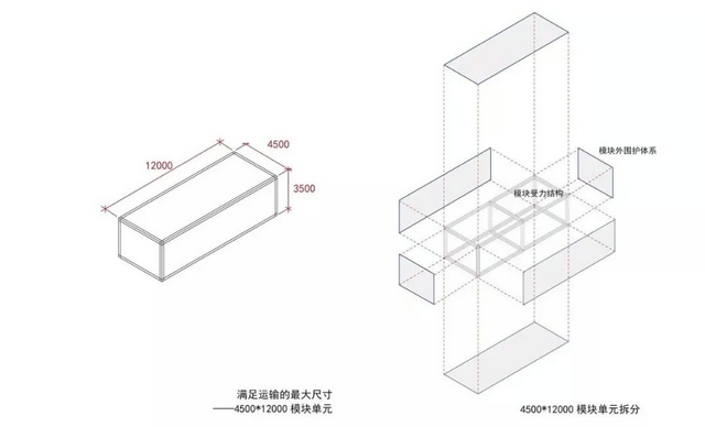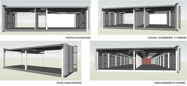項目由6棟辦公樓、1棟酒店和布置于場地中部的商業、機房服務設施共同組成。商業和機房服務設施頂部為連續的室外平臺,將各建筑連為一體。辦公樓與酒店設計以4m×12m的集裝箱作為基本單位,適合運輸,便于靈活組合。辦公基本單元為1000~1200m2左右的“十字”單元組合。