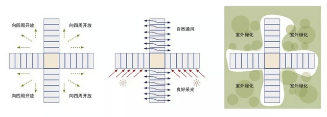 十字單元布局,實現建筑在視野、通風采光和綠化等方面的開放格局