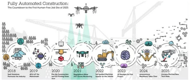 在過去幾年中,我們已經見證了云計算、無人機、機器人、增強現實、虛擬現實、物聯網、BIM、預制施工等技術在建筑業的快速應用。有理由相信,新技術與建筑業的融合還將繼續加速。而在以自動化、智能化為核心的技術變革之下,建筑業在未來對人類勞動力的需求量將大幅下降。那么,到底什么時候才會出現主要由機器人施工和管理的建筑工地呢?