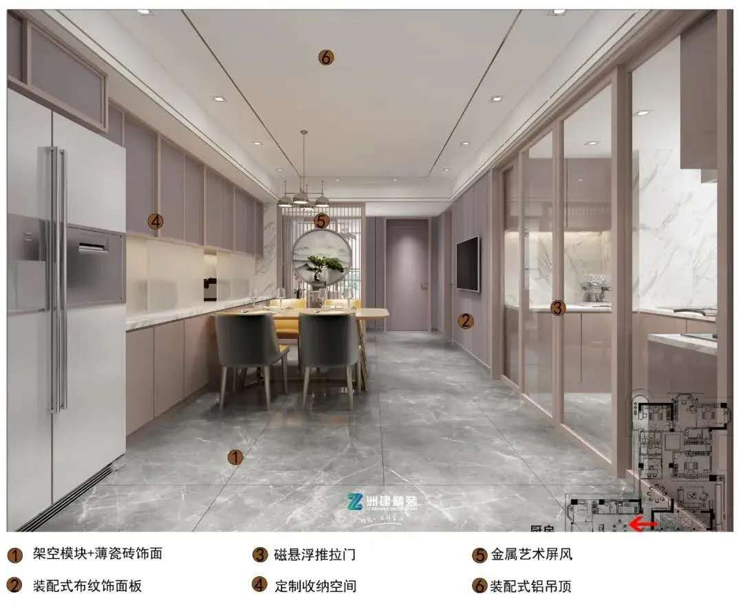 柜體與墻體預留掛件,契合度高;膠衣臺面耐磨、抗污、抗裂、抗老化,無放射性;整體廚房全部干法作業,現場裝配率200%;無需排煙道,節省廚房空間。
