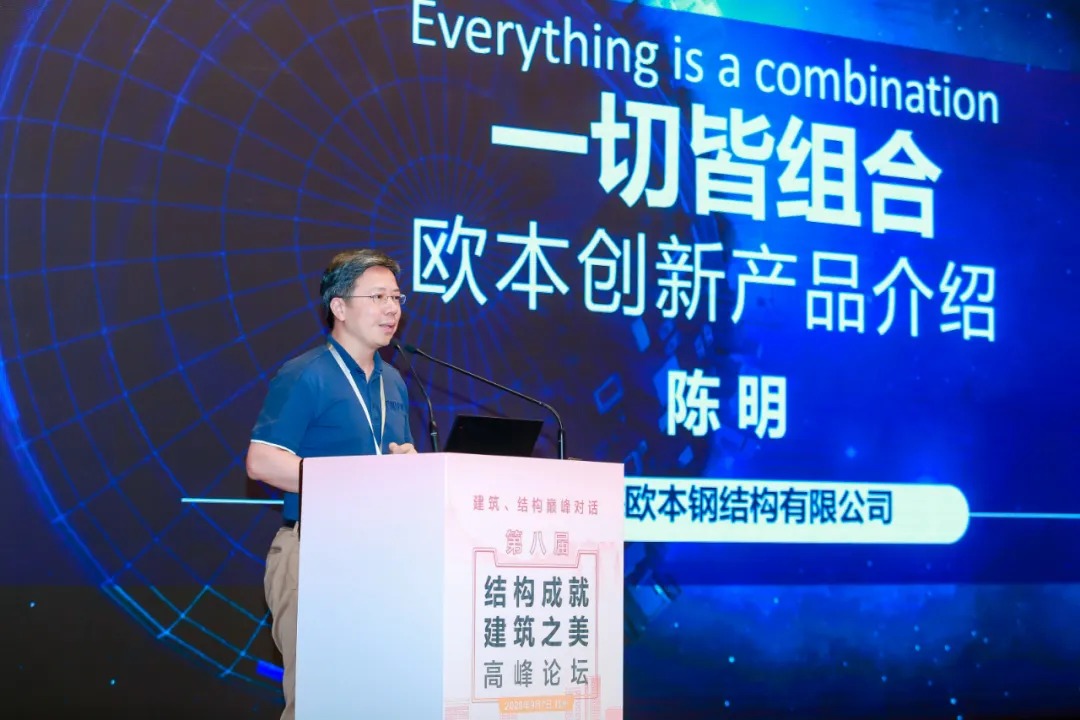 在“第八屆結構成就建筑之美高峰論壇”上,歐本董事長陳明先生以“一切皆組合”為主題進行演講。陳明先生在演講中介紹了歐本的創新之路,從“引進國外產品”到“自主研發創新”,在結構創新道路不斷探索,領悟到幾乎所有創新都是在已有技術的基礎上的重新組合升級,新的組合就是創新。基于這樣的理念,推出了甲殼柱、甲殼梁、優腹梁、優肋板等自主研發產品,通過對已有產品的創新組合,有效解決了傳統建造方式的弊端,并且編制了相關行業標準:《波紋鋼板組合框架結構技術規程》,《優肋免拆模組合樓板圖集》