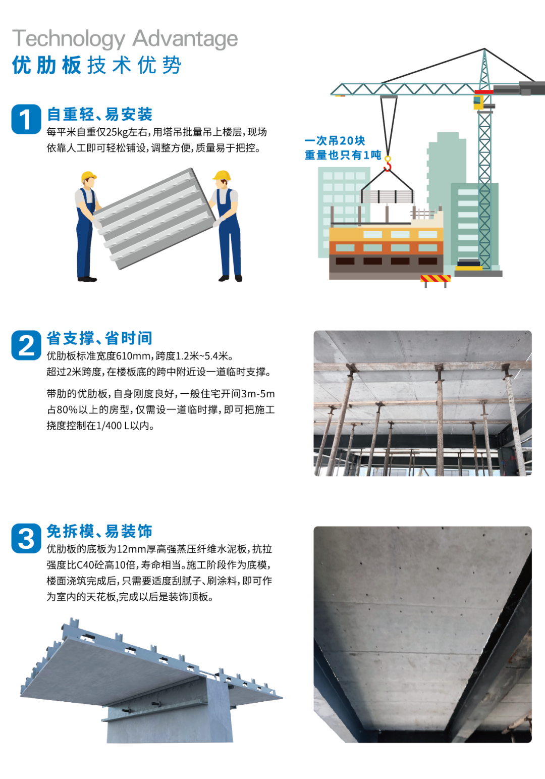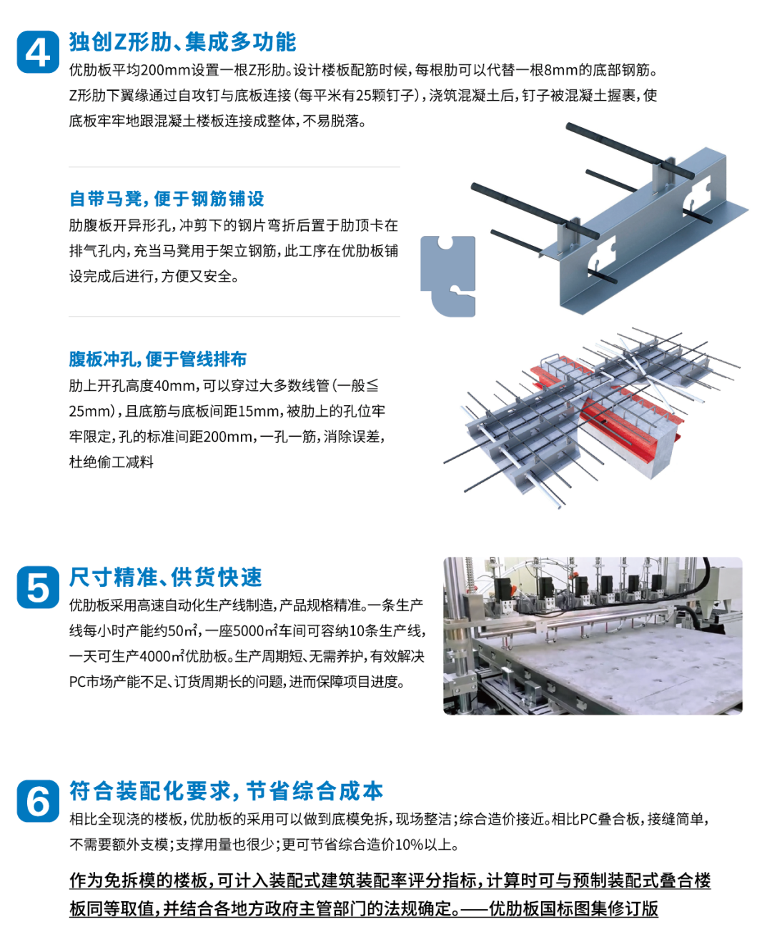 優肋板是歐本研發的新型疊合樓層板,采用冷彎薄壁型鋼加工成肋、通過螺釘與底部的纖維水泥板結合;肋上連續沖孔,板內可以穿鋼筋和管線;纖維水泥底板在澆筑混凝土時作為模板,只需少量支撐即可,完成后無需拆除,對結構來說是保護層,對建筑來說是裝飾層。其構造簡潔易于施工,非常符合裝配式建筑發展的要求,在成本控制、工廠生產及現場安裝節點處理上都具有明顯優勢,具有廣闊的市場潛力。