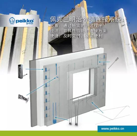 該三明治墻板融合了佩克的PD-tie斜對角不銹鋼連接件,JENKA內螺紋起吊件,墻體豎縫-PVL鋼絲繩連接環,墻體水平縫-SUMO螺栓連接座四種產品。具有保溫效果好,安裝快捷,安全可靠的特點。