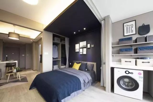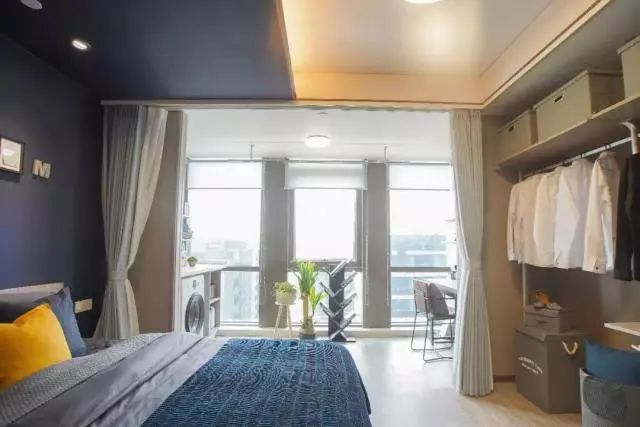 36㎡戶型的臥室空間,吊頂?shù)碾p層拼接和頂面到墻面的同色銜接是一大亮點(diǎn)。我們可以看到頂面有兩個(gè)體系,高頂?shù)陌咨糠质擒浤ぃ|(zhì)感和視覺效果和傳統(tǒng)的乳膠漆沒有區(qū)別,并且這個(gè)膜具有很強(qiáng)的張力,可以在上面開洞,安裝燈、噴淋口燈設(shè)備,這就是品宅的軟膜天花吊頂體系。旁邊深藍(lán)色的低頂,是仿乳膠漆效果的膜,采用了與墻面同色的膜材覆在竹木纖維板上,通過裝配式吊頂體系獨(dú)有的配件,固定在龍骨上,整個(gè)板沒有刷漆等過程,安全、環(huán)保、快速,同時(shí)可以實(shí)現(xiàn)從頂?shù)降氐耐昝来钆洹?br />